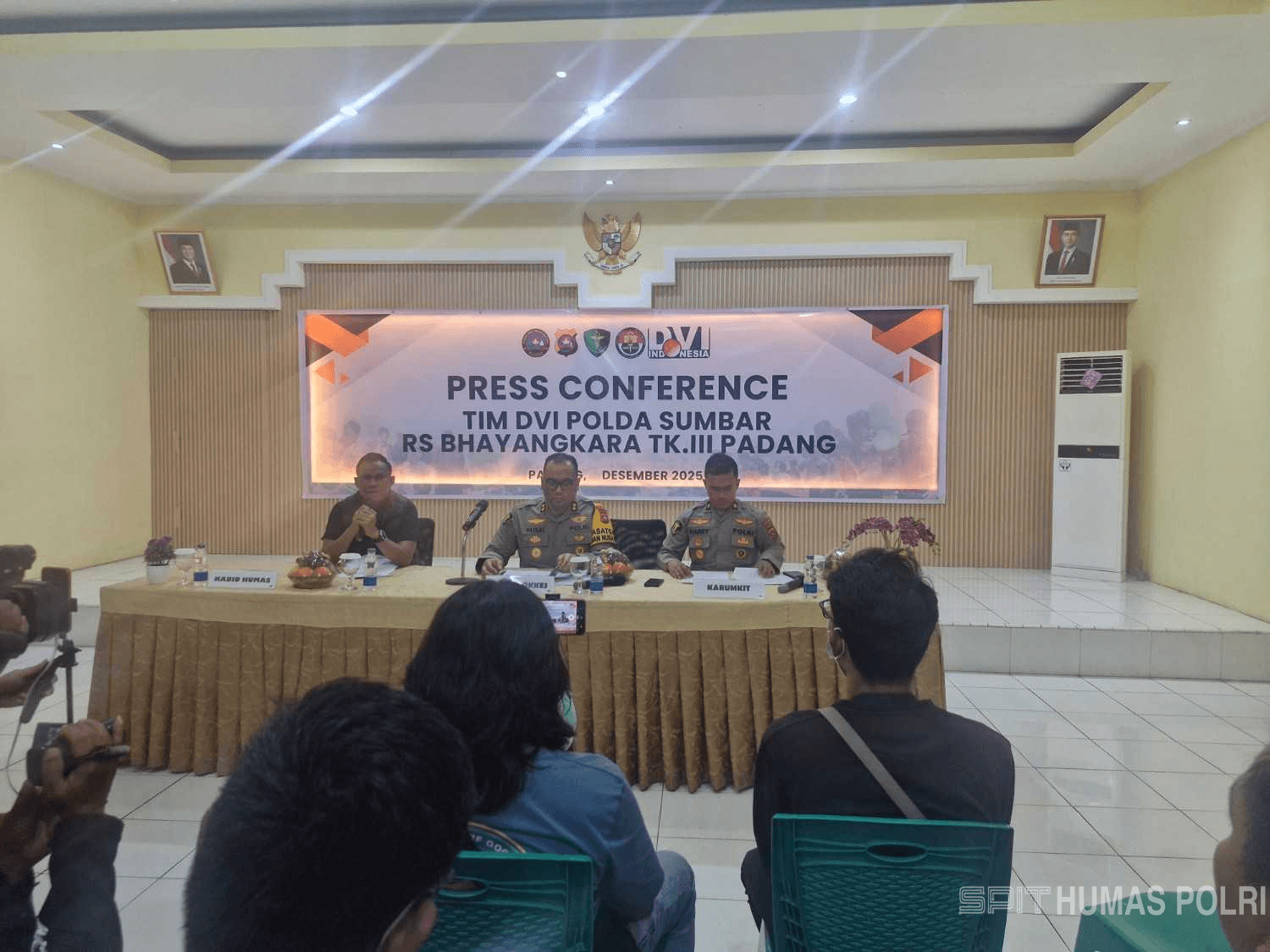 PADANG. Blok7.id – Tim Disaster Victim Identification (DVI) Biddokkes Polda Sumbar menggelar konferensi pers terkait perkembangan identifikasi korban banjir bandang dan longsor di Aula Rumah Sakit Bhayangkara Tingkat III Padang, Selasa (2/12/2025).