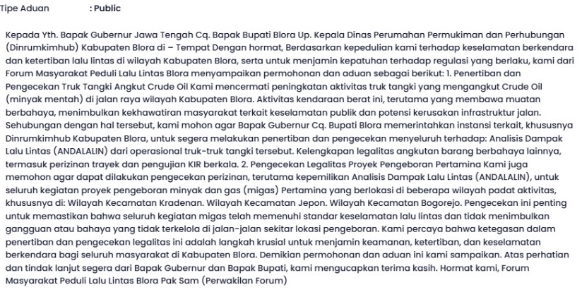 Dalam suratnya, Forum Masyarakat Peduli Lalu Lintas Blora secara tegas mendesak Gubernur Jateng Cq. Bupati Blora untuk memerintahkan Dinrumkimhub Blora segera melakukan penertiban dan pengecekan menyeluruh terhadap, Andalalim Truk Tangki Angkut Crude Oil, memastikan setiap operasional truk tangki telah memenuhi persyaratan dampak lalu lintas.