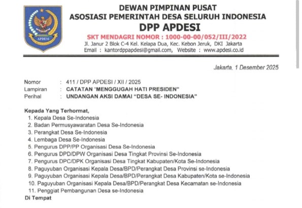 Undangan tersebut tertuang dalam surat bernomor 411/DPP APDESI/XII/2025, yang menegaskan bahwa aksi ini merupakan penyampaian aspirasi secara damai, tanpa muatan politik, dan APDESI hadir semata sebagai fasilitator.