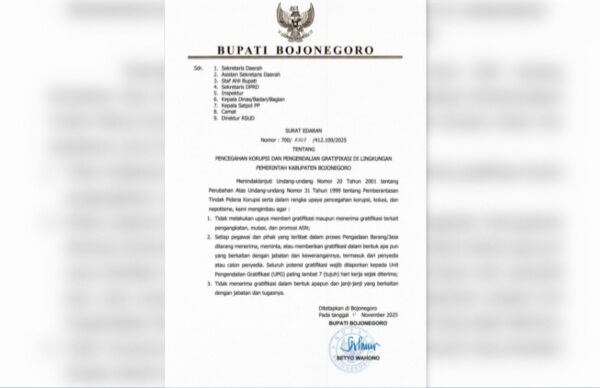 Adapun dengan diterbitkannya SE ini, Bupati Setyo Wanoho berharap seluruh ASN Bojonegoro dapat lebih patuh terhadap aturan, sehingga praktik gratifikasi dapat dicegah sejak dini.