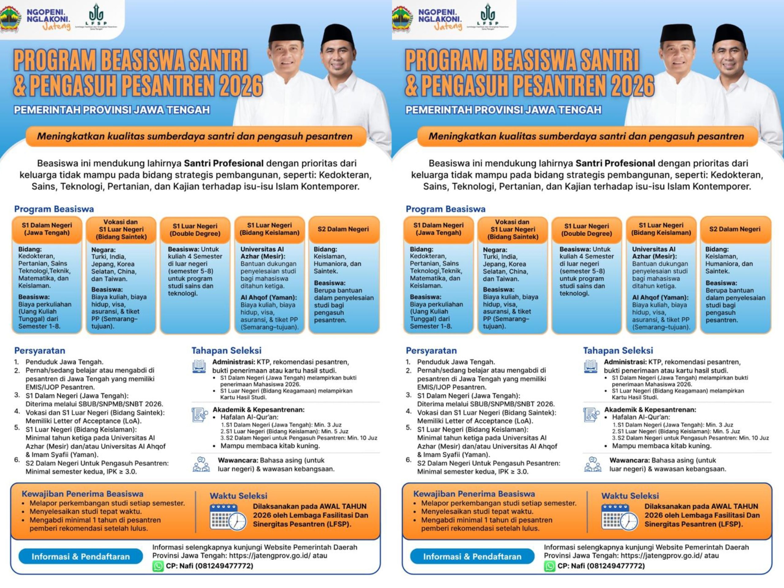 Seleksi beasiswa akan digelar pada awal 2026, dan informasi pendaftaran bisa diakses melalui laman resmi Pemprov Jateng di https://jatengprov.go.id.