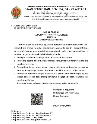 Surat yang ditujukan kepada seluruh Kepala SMA, SMK, dan SLB se-DIY itu dikeluarkan menyusul viralnya ajakan dan hasutan di media sosial untuk mengikuti aksi anarkis yang direncanakan berlangsung pada Selasa, 24 Februari 2026, serta adanya sejumlah aksi serupa di beberapa wilayah.