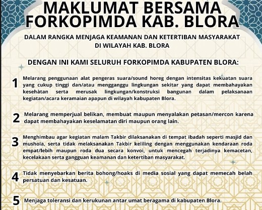 Thank you for reading this post, don't forget to subscribe!Dalam maklumat tersebut, seluruh unsur pimpinan daerah yang tergabung dalam Forum Koordinasi Pimpinan Daerah Kabupaten Blora menegaskan sejumlah larangan dan imbauan kepada masyarakat agar situasi di wilayah Blora tetap aman, damai, dan kondusif.