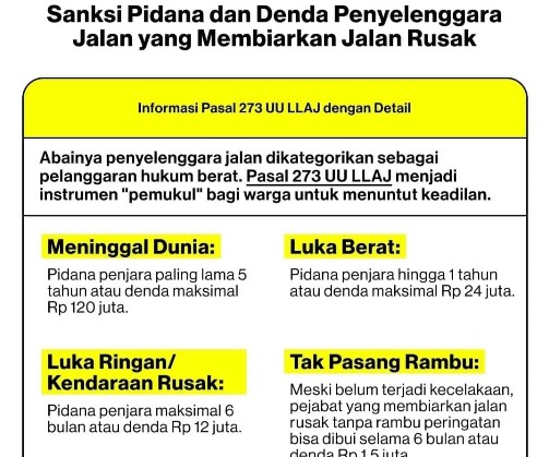 “Bagi warga, Pasal 273 UU LLAJ dapat menjadi instrumen hukum untuk menuntut keadilan, bahwa setiap korban kecelakaan akibat jalan rusak berhak atas pertanggungjawaban yang jelas dan tegas,” tutup isi selebaran yang viral.