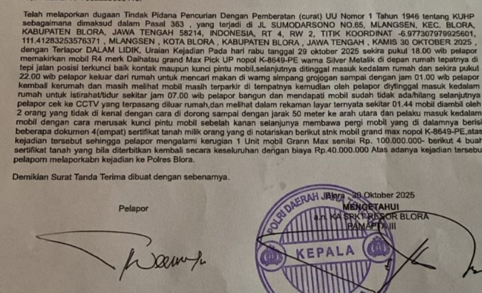 Berdasarkan Laporan Polisi Nomor: LP/B/39/X/2025/SPKT/POLRES BLORA/POLDA JAWA TENGAH, korban, Wahyu Bella Prihantoro (35), seorang wiraswasta, baru menyadari mobilnya hilang sekitar pukul 07.00 WIB saat bangun tidur.