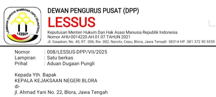 Thank you for reading this post, don't forget to subscribe!Lembaga Swadaya Masyarakat (LSM) Survive Sambong Cepu Sejahtera (LESSUS) adukan oknum Kepala Kelurahan (Lurah) wilayah Kecamatan Cepu ke Kejaksaan Negri Blora, Jawa Tengah, Senin (14/7/2025).