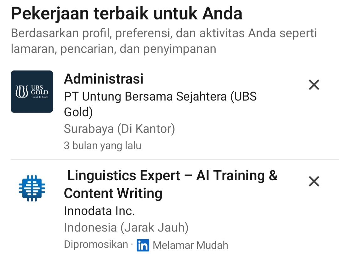 LinkedIn lebih dari sekadar portal lowongan kerja, karena juga berfungsi sebagai jejaring sosial profesional. Pengguna dapat membangun profil komprehensif untuk menampilkan keahlian dan pengalaman, serta terhubung langsung dengan perekrut dan pemberi kerja. LinkedIn ideal bagi mereka yang ingin membangun reputasi profesional sekaligus mencari peluang karier.