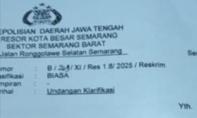 Yang bersangkutan diminta hadir untuk memberikan keterangan di Ruang Reskrim Tim III Polsek Semarang Barat pada Rabu, 19 November 2025 pukul 10.00 WIB.
