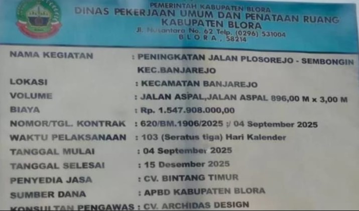 Diketahui, proyek Peningkatan Jalan Plosorejo–Sembongin ini dikerjakan oleh CV Bintang Timur dengan pagu anggaran sebesar Rp1.547.908.000 yang bersumber dari APBD Kabupaten Blora. Pekerjaan dimulai sejak 4 September 2025 dan seharusnya rampung dalam waktu 103 hari kalender, yakni pada 15 Desember 2025.